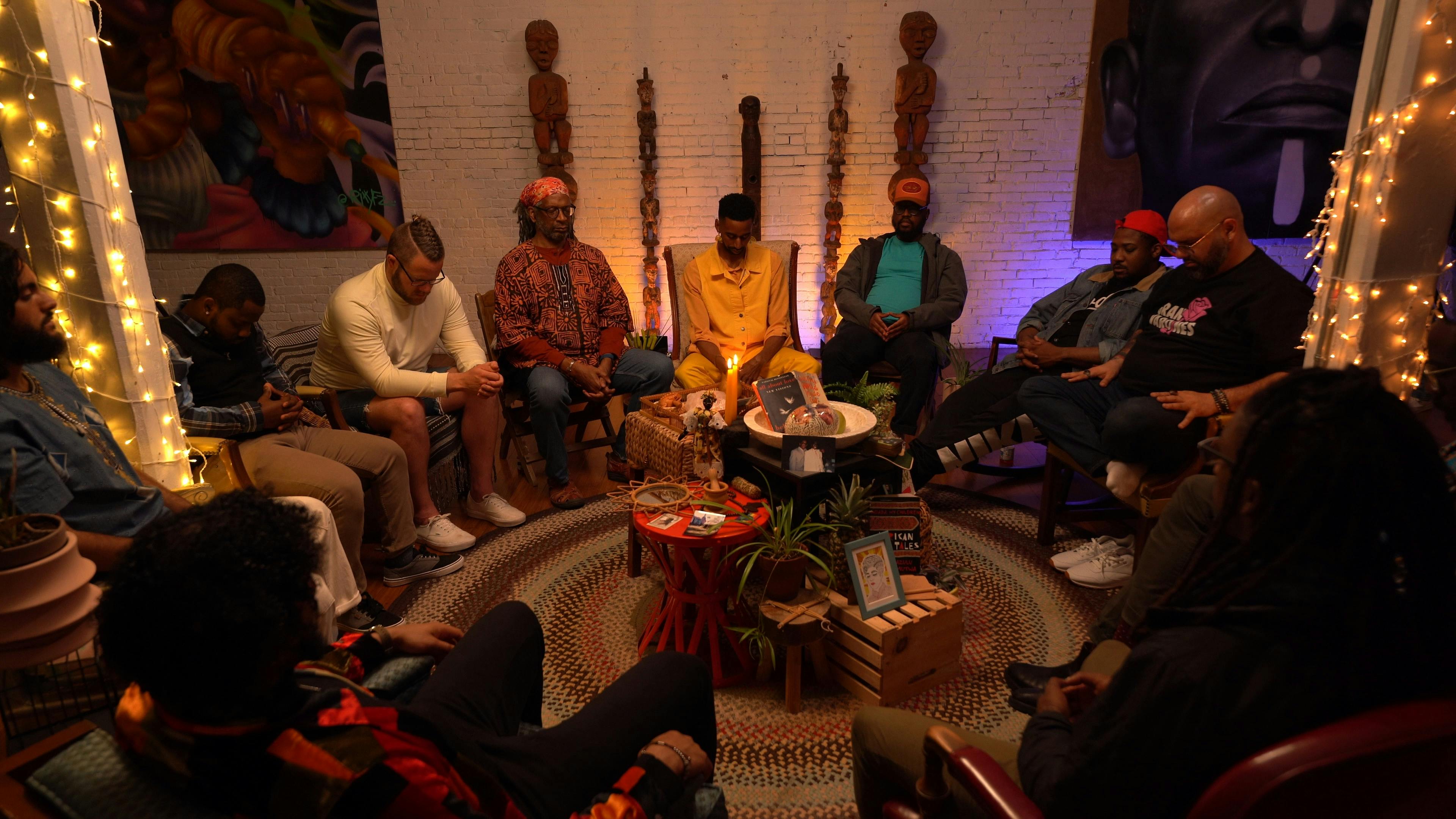 Loving Men, a documentary film, bears witness to a Boston-based transformative “men’s” group redefining healthy masculine identities in community. Through honest conversation and intentional fellowship, Loving Men captures the radical possibility of what can emerge from men’s groups and circles, documenting masc-presenting people demonstrating vulnerability and practicing healing with one another as they are seen, held, and held accountable. The men’s group or men’s circle is a collective infrastructure for community-led care, challenging sexist and patriarchal modes of maleness and offering a path towards community repair.